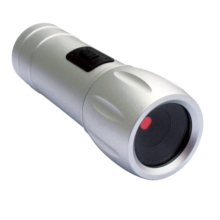 Turning to the camera, it looks like a LED torch. The model I have is silver, and no other colours seem to be available. The literature says that the camera has a, “weather resistant anti-corrosive casing” so I am not sure exactly what metal it is made from, but due to how light it is, and the feel, I would guess at aluminium, but don’t quote me on that. There is a plastic panel halfway down the camera, that has four LED’s, one at each corner, and a REC/PAUSE button. There is also a small hole for the microphone on the panel as well. At the back of the camera is a screw top, that can be removed to expose the MicroSD card slot, Mini USB port, and on off switch. When the cap is on, the camera is a sealed unit. How sealed, I don’t know, but it won’t be waterproof. Splash-proof, and dirt-proof certainly though. Perfect for muddy use, but don’t take it scuba diving.