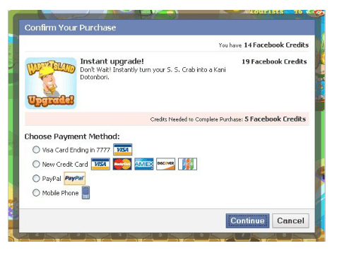 “By providing a single, cross-application currency, our goal is to [make] transactions simpler for users, leading to a higher conversion rate for developers. Specifically, our early testing has shown that users paying with Facebook Credits are significantly more likely to complete a purchase than the average Facebook user.”