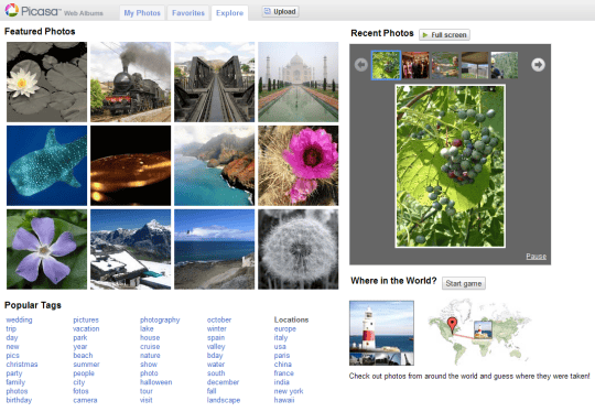 Picasa now also features an Explore Page which displays the most popular public photos uploaded by members. The photos are displayed in a 3 X 4 grid making it very clear to navigate and also shows the latest uploaded photos in a slide-show widget. If you’re not sure where to start, it also provides a list of the most popular tags.