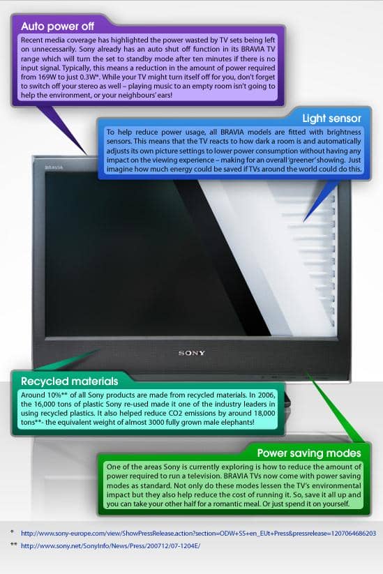 I don’t know if you’ve noticed, but there seems to have been a recent spate of TV shows and documentaries focusing on the plight of the planet and how we all need to be a bit more environmentally friendly. Well if you’re watching these stories on one of Sony’s new Bravia TVs, there’s less need to feel that impending sense of environmental guilt. Unless you’ve left the light on in the kitchen unnecessarily.