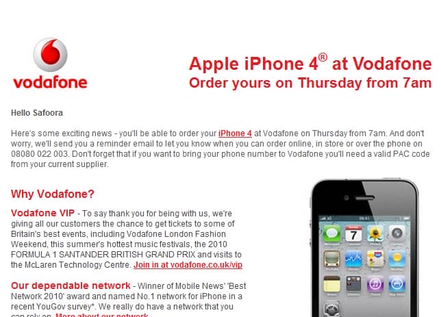 The iPhone 4 release date is here and the first one to kick off the ordering of the iPhone 4 is Vodafone. I received an email yesterday evening saying that orders for the iPhone 4 on Vodafone will take place at 7 am, so if you’re up early like me and can’t get yourself to the store then order yours online here or click on the buy now link.