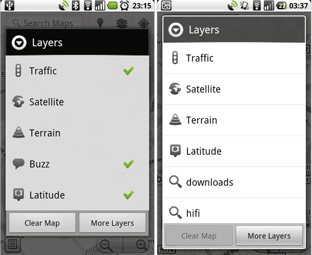 The looks change in menus has been discovered thanks to someone looking into the code of the newest Google Maps version in a part which shows what menus to display. For Android 2.2 Froyo, the menu is set as level 8, but the code also contains a level 9 menu which has yet to be used. The one who did the code searching canadiancow, managed to switch the two menus on their device which shows us what the new version may look like (old version: left, and new version: right shown below).
