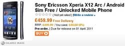 Sony Ericsson Xperia Arc, a 4.2 inch display phone with 8.1 megapixel camera, is now available for pre-order from British retailing website Play.com. The phone is listed with an RRP of £499.99 but for pre-ordering the phone, you just need to part with £459.99. Sony Ericsson has not announced any launch date yet but the site itself has stated April 1 as the release date.