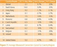 South Korea tops the list with an average broadband speed of 14.4 Mbps in the first quarter of 2011, whereas the average global speed stood at mere 2.1 Mbps. Hong Kong and Japan grabbed second and third spot with 9.2 Mbps and 8.1 Mbps broadband speed. The world is also moving away from narrowband and the technology saw 15 percent drop in its use in the first quarter.