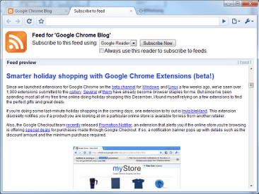 One feature lacking in Google Chrome is a built-in feed reader, RSS Subscription Extension looks to rectify this glaring omission. Whenever you land on a page that contains a RSS or Atom feed you will be greated with a orange RSS icon appears in the address bar. This will then add it to your Google Reader.