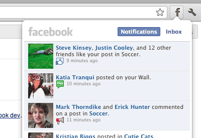 The official Facebook Chrome Extension is the perfect way to keep up to date with your Facebook. It shows you your alerts and notifications in a snazzy drop down box.