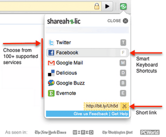 Shareaholic is the perfect tool for anyone who loves to share. You'll find every bookmarking/blogging/note taking extension integrated into this one sleek and fast mega extension. You can share stuff to Facebook, Twitter, Gmail, Evernote, Delicious, Instapaper, Digg and even blog it, all from one simple all-in-one browser extension and it won't slow down your browser either. What else? It will automatically short the URLs for you using your very own bit.ly account and you can also use the keybaord shortcuts with it too.