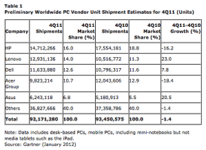 Globally, Asus and Lenovo showed improvement during the last quarter of year 2011. Lenovo increased its sales volume by 23 Percent and Asus also performed well with 20.5 percent increase in its PC demand. Dell also registered 7.8 percent growth globally. Overall, HP, despite its slide, managed to retain its top position globally and in the US.